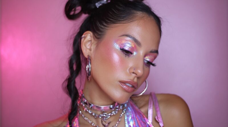 Glitterbels Chrome Pigments extend chrome styling into eye accents. Kaeso high-shine skincare supports luminous complexion prep. Crazy Color metallic hair tints complete a head-to-toe Y3K aesthetic, aligning hair with makeup design.
